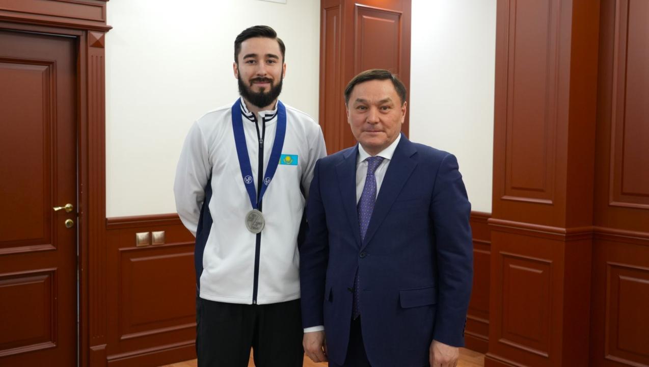 Кездесу барысында министр спортшының әлем чемпионатындағы жетістігін жоғары бағалап, алдағы уақытта да ел намысы сыналатын маңызды турнирлерде табысты өнер көрсетуіне тілекші екенін жеткізді.